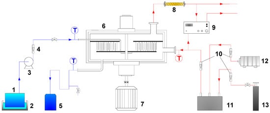 Experimental setup: (1) absorbent container; (2) thermostatic bath; (3) liquid pump; (4) liquid rotameter; (5) effluent tank; (6) RZB; (7) motor; (8) dryer; (9) CO2 analyzer; (10) gas rotameter; (11) gas mixing tank; (12) air compressor; (13) CO2 cylinder.