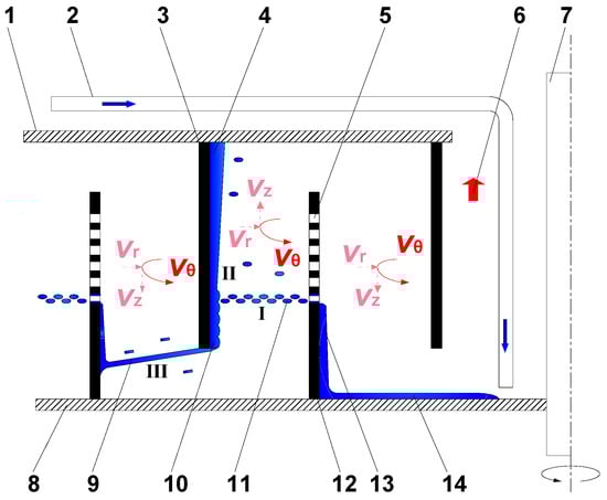 Side view of gas and liquid flow in RZB rotor: (1) static disk; (2) liquid inlet; (3) static baffle; (4) stagnant filmy liquid; (5) perforations; (6) gas stream; (7) shaft; (8) rotating disk; (9) flying filmy liquid; (10) turbulent filmy liquid; (11) flying fine droplets; (12) rotating baffle; (13) filmy liquid climbing up on the internal surface of rotating baffle; (14) filmy liquid on the rotating disk. (Red and blue symbols represent gas and liquid flows, respectively.).