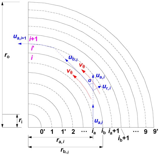 The space in the rotor of the RZB was divided into certain annular regions for model development (Figure 4). Nine rotating baffles (1, 2, …, ia, ia + 1, …, 9) and ten static baffles (0′, 1′, …, ib, ib + 1, …, 9′) were radially alternately arranged. Region i was the annular region between the rotating baffle ia of radius ra,i and static baffle ib of radius rb,i, and region i’ was the annular region between the static baffle ib of radius rb,i and rotating baffle ia + 1 of radius ra,i+1. Mass transfer zones I and II were located in region i, while zone III was in region i’.