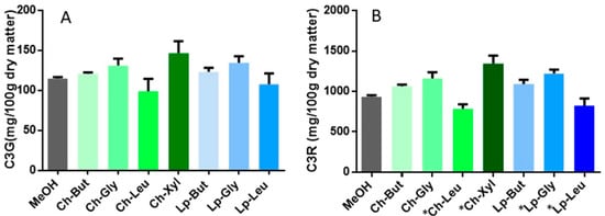 Cyanidin 3-glucoside (A) and Cyanidin 3-rutinoside (B) concentration (mg 100 g−1 dry matter) in different extracts of eutectic solvents tested in lyophilized jussara samples. The * marks DES mixtures with results statistically different from the control (MeOH).