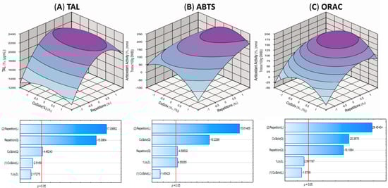 (A) Surface model for total anthocyanin level (TAL) (mg/100 g dry matter) from Ch-Xyl extract from E. edulis pulp for repetition and co-solvent as main effects and Pareto chart of the results. (B) Surface model for ABTS (mmol Trolox 100 g−1 dry matter) and Pareto chart of the results. (C) Surface model for ORAC assay (mg/100 g dry matter) and Pareto chart of the results.