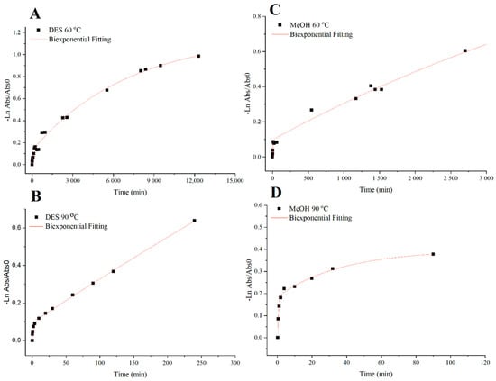 All tubes were placed in a water bath and heated at 60 °C or 90 °C, removing triplicates of each extract (DES or MeOH) at random times. The samples were immediately cooled in an ice bath for 10 min after removal. After this time, they were placed at room temperature for 50 min before reading the absorbance in a spectrophotometer (520 nm). When the absorbance pointed to half the original value (0.4), the assay was finished and results were plotted, and the emerging curve behavior was analyzed.
