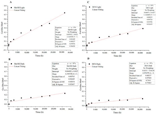 Degradation kinetics of anthocyanins extracted with MeOH (A) light and (B) Dark and Ch-Xyl (C) Light, (D) Dark in both conditions. The correlation coefficients of all curves are R2 ≥ 0.99.