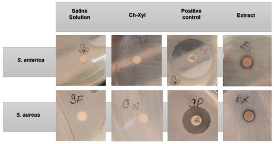 Disc-diffusion antimicrobial sensitivity. Representation of halos of inhibition for S. enterica and S. aureus in four treatments: saline solution, DES only (Ch-Xyl), positive control (meropen and vancomycin respectively), and optimized extract.