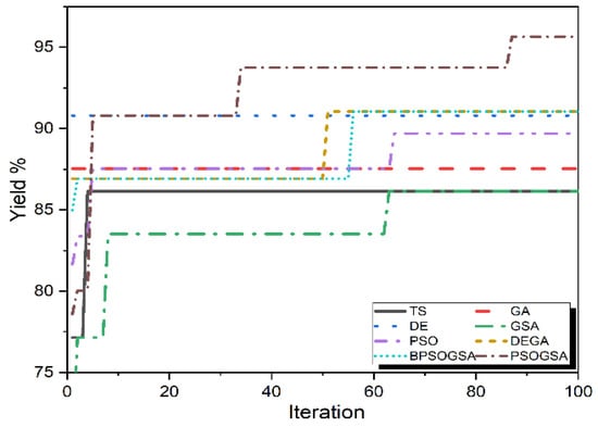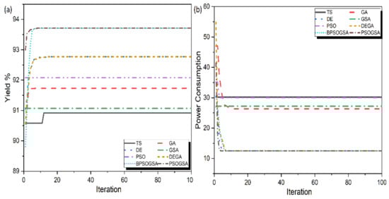 In this case study, the maximization of yield % () and minimization of power consumption () using TS, GA, DE, GSA, PSO, DEGA, BPSOGSA and PSOGSA is carried out. The convergence curve of yield % and power consumption with the iterations is shown in Figure 3. The optimization is performed considering 30 search members and maximum iterations of 100. Figure 3a shows that despite the maximization of yield %, GSA and PSO did not show any improvement in the best value as the iterations progressed. On the other hand, the three remaining traditional algorithms, i.e., TS, GA and DE, converged to their respective best value in the 12th, 7th and 15th iterations. The hybrid algorithms, i.e., DEGA, BPSOGSA and PSOGSA, converged to their respective best values in the 13th, 9th and 8th iterations. Thus, for the yield % objective, all the functions recorded very fast convergence to their respective best values. Nevertheless, it is worth mentioning that, except BPSOGSA and PSOGSA, all the other algorithms converged to relatively poorer solutions. A similar trend is observed in Figure 3b, where convergence characteristics of the tested algorithm in the power consumption minimization scenario are reported. However, here, the DE, DEGA, BPSOGSA and PSOGSA all were able to locate the best-known optimum, which may be the global optimum.