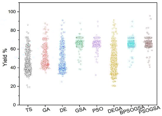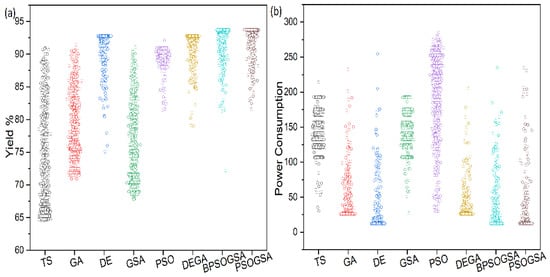 Scatter of the 3000 function evaluation values for TS, GA, DE, GSA, PSO, DEGA, BPSOGSA and PSOGSA is presented in Figure 4. It is seen that the distribution pattern of DE, PSO, DEGA, BPSOGSA and PSOGSA is somewhat similar. Major accumulations of function evaluation values are seen to be clustered in the higher yield % zone. On the other hand, the other three algorithms, i.e., TS, GA and GSA, showed throughout the distribution of the function evaluation values. Similar observations are made from Figure 4b, where GA, DE, GSA, DEGA, BPSOGSA and PSOGSA showed good concentrations of solutions in the lower power consumption zone, indicating that the algorithms spent a relatively smaller number of function evaluations to locate the potential global optimal zone.