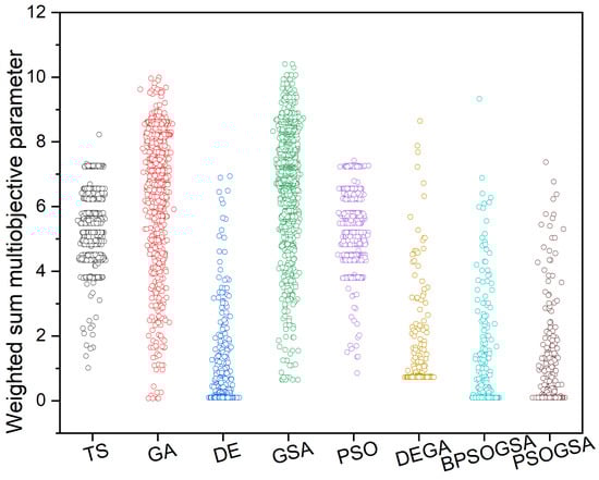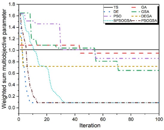 The performance analysis of the eight optimizers in the weighted sum multi-objective environment is given in Table 5. In multi-objective optimization, the minimum value of the function is obtained using PSOGSA, whereas for DEGA and BPSOGSA, the obtained solution is almost on par with that of PSOGSA.