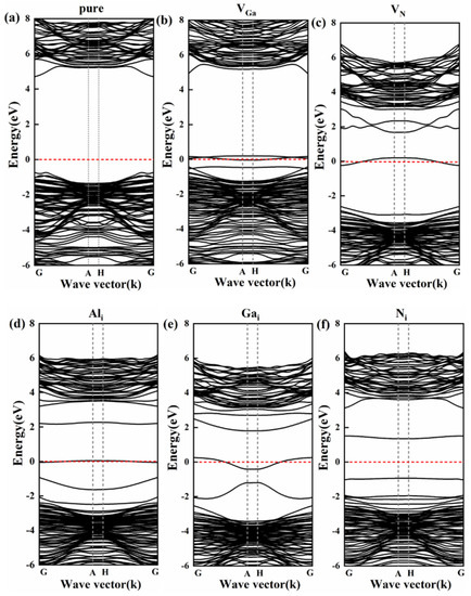 Band structures of different models: (a) pure Al0.5Ga0.5N nanowires, (b) VGa, (c) VN, (d) Ali, (e) Gai, (f) Ni.