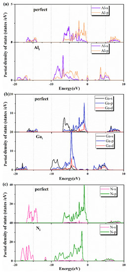 Immediately afterwards, in order to have a deeper understanding of the changes in the band structure, the partial density of states (PDOS) are also considered. Figure 4 shows the PDOS of Al0.5Ga0.5N nanowires with different defects. It can be seen from Figure 4a–c that the interstitial defects introduce a new p-type electronic state near the Fermi level and move toward the lower energy direction, thus passing through the Fermi level and showing n-type characteristics. Among them, the influence caused by Al and Ga interstitial defects is the most obvious. As shown in Figure 4d, due to the lack of N atoms, the density of states of Ga atoms moves towards lower energy as a whole and the total electronic states of Ga atoms decrease. As shown in Figure 4e, due to the lack of Ga atoms in the core position, the peak value of the total electronic states of N atoms has been reduced. Meanwhile, the electronic state of the N atom at the Fermi level is no longer zero and has certain p-type structural characteristics.