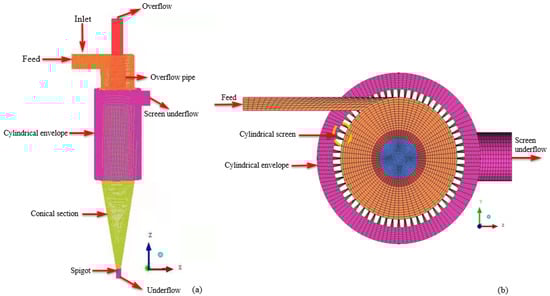 This study took into account a 75 mm TPHS, whose diagrams are shown in Figure 1 (a) front view and (b) vertical view. In general, the TPHS is made up of a hydrocyclone, a cylindrical screen, a cylindrical envelope, inlet and outlets, and so on. The working principle of the TPHS is partially analogous to that of a conventional hydrocyclone. The slurry was measured at a velocity along the tangential inlet into the TPSH and was forced to move in a circular path by the geometry. In addition to the typical inner and outer spirals, the screen underflow was produced near the cylindrical screen in the TPHS [10]. This fluid behaviour was caused by the current screen, which clearly plays a role in improving the device performance. As a result, an abstract model was created to focus on the process of the fluid penetrating under the sieve, corresponding to the part of the yellow-dotted coil in Figure 1b that is shown in Figure 2a. In this model, a single screen and a fan channel with a rectangle inlet, rectangle outlet, screen aperture, and screen-underflow outlet were combined. Table 1 describes the specifics of each section. The fluid entered through the rectangle column-section inlet and exited through the same-size column-section outlet. Furthermore, some fluid was drained through the screen aperture due to the current screen aperture. Furthermore, the cylindrical coordinate system depicted in Figure 2b was assigned to study the fluid motion (see the details in Section 3.2).