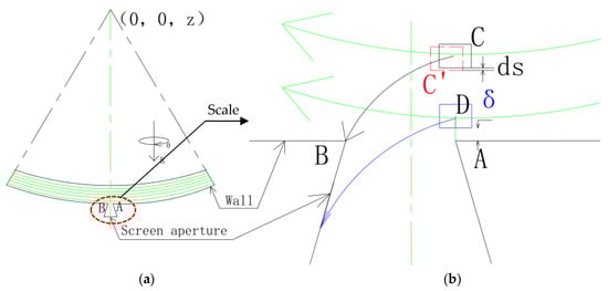 Due to the width of the screen aperture being small, the tangential velocities during the above permeating process can be considered to remain constant. In Figure 3b, set the variable Δ as the distance from the fluid microelement to the wall. Assume that Δ is equal to Δs which implies the limit distance of the fluid-penetrating screen. Namely, only the fluid within this distance can pass through the screen, and vice versa. Based on this, the flow rate q in the 2D plane flow can be calculated: