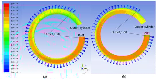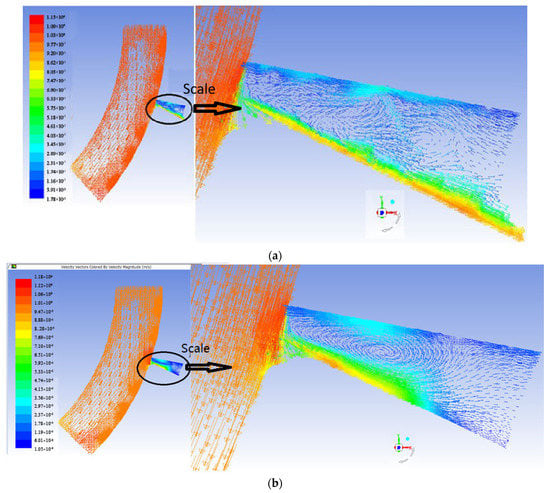 The inlet velocity in the current simulation was 0~20 m/s. Where other velocities were comparable, the feed velocity of 1 m/s was chosen for the following analysis. The velocity vectors of the simple models of the (a) ideal and (b) viscous fluid, with an inlet velocity of 1 m/s, are shown in Figure 4. The fluid clearly flowed along the channel in this figure, but due to the current screen aperture, the fluid passed through the screen to generate the screen underflow. The fluid velocity remained relatively stable in the main channel (i.e., the arc channel), but changed rapidly near the screen aperture. This is due to the formation of the screen backflow. In detail, due to the blockage of the screen wall, the tangential velocity of the screen underflow rapidly decreased to 0 m/s, quickly converted to the radial velocity, and then quickly discharged via the screen-underflow outlet. With this change in flow velocity, the fluid experienced a rapid conversion between dynamic and static pressure. In comparison to Figure 4a,b, the ideal fluid exhibited a greater radial velocity over a longer distance, whereas the viscous fluid exhibited a larger velocity gradient with an obvious vortex along the vertical screen wall. The presence of the vortex increased the energy consumption while decreasing the radial velocity.