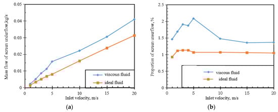Furthermore, when comparing Figure 5a,b, it is clear that increasing the inlet velocity from 0~20 m/s increased the mass flow of the screen underflow, but the percentage of the screen underflow showed different trends. In particular, as the inlet velocity increased, both the ideal and viscous fluid showed a similar distribution, i.e., the percentage of the screen underflow first rose to a peak, then fell, and then finally remained stable. This shows that, while the mass flow of the screen backflow increased with the increasing inlet velocity, the corresponding proportion increased first, then decreased and presented the peak value.