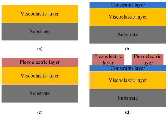 The form of viscoelastic damping laid on the substrate structure. (a) Free damping structure; (b) passive restraint damping structure; (c) active constraint damping structure; and (d) intelligent damping structure.