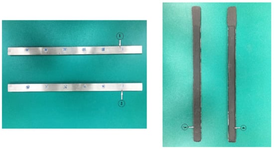 Figure 2 shows the prepared four specimens, specimens 1 and 2 are base material made of stainless steel; specimen 3 is a composite structure coated with viscoelastic damping material on base material 1, the thickness ratio of the damping layer to the base material is 1:1; and specimen 4 is a composite structure coated with viscoelastic damping material on base material 2, and the thickness ratio of the damping layer to the base material is 2:1. The specific parameters of the four specimens are shown in Table 2: