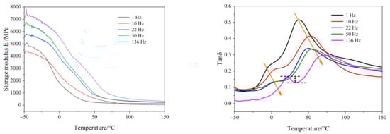 Under the action of external force, the change of material stress–strain relationship with temperature, frequency, and other conditions is analyzed, which is called dynamic mechanical analysis []. The storage modulus (E’), loss modulus (E”), and loss factor (tanδ) of the material can be obtained through dynamic mechanical analysis. The change characteristics of modulus and loss factor with temperature, frequency, and other conditions can be tested, such as damping properties, phase structure and phase transition, molecular relaxation process, polymerization kinetics, etc.