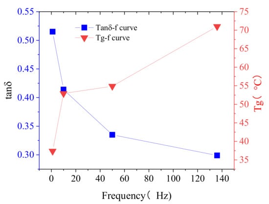 It can be seen from the Tanδ-temperature change curve in Figure 6 that the loss factor first increases and then decreases with the increase of temperature, and there are two peaks in the change process: a main peak and a shoulder peak. The main reason is that the damping material is prepared by using two base fluids, which can broaden the temperature range of the damping material. The influence of frequency on the material loss factor is mainly reflected in the change of the peak size and the Tg corresponding to the peak value. It can be seen from the Figure 7 that the higher the frequency, the larger the Tg, and loss factor becomes smaller. When the frequency is 1 Hz, the loss factor Tanδ is 0.515, and Tg is 37.37 °C; when the frequency is 10 Hz, the loss factor Tanδ is 0.414, which is 19.61% smaller than the loss factor of 1 Hz, and the Tg is 52.92 °C, which is 41.61% higher than Tg of 1 Hz. When the frequency is 50 Hz, the loss factor Tanδ is 0.335, which is 19.08% lower than the loss factor of 10 Hz, and the Tg is 54.89 °C, which is 3.72% higher than Tg of 10 Hz; when the frequency is 136 Hz, the loss factor Tanδ is 0.299, which is 10.75% lower than the loss factor of 50 Hz, the Tg is 71.01 °C, an increase of 29.37% relative to the Tg of 50 Hz. At the same time, an obvious trough is formed between the two peaks, and the fusion of the two peaks is reduced, which affects the effect of widening the temperature range.