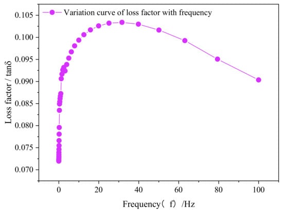 It can be seen from Figure 8 that at room temperature, the storage modulus E′ and the loss modulus E″ show an increasing trend with the increase of frequency, while the loss factor first increases and then decreases with the increase of frequency. The molecular chain of viscoelastic damping material is long, at high frequency, and does not have enough time to adjust after being excited; the response to stress can only change the distance between molecules with the help of extremely high energy, showing high modulus and low loss factor. As the frequency decreases, the molecular segments realign and the localized strain caused by the stress relaxes, resulting in a decrease in modulus, and the loss factor reaches its maximum value when the frequency is comparable to the molecular relaxation time. When the frequency is lower, the local strain of the molecular chain is relaxed to a greater extent, and the local interaction between the molecular chains prevents the long-range motion of the chain segment, so the storage modulus and loss modulus change greatly at this time, and the loss factor is sharply down; damping performance is reduced.