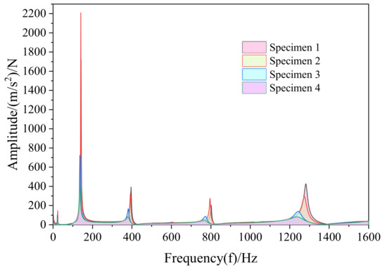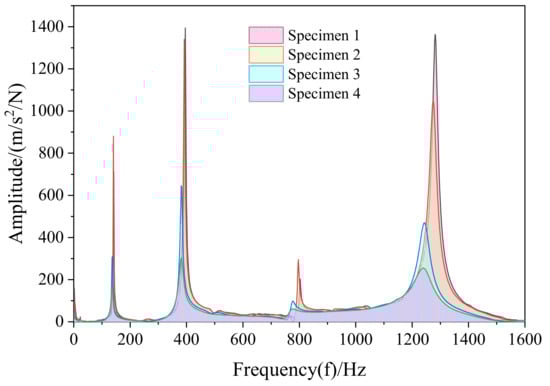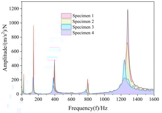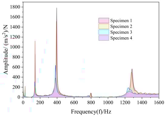 Compare the frequency response function within 0–1600 Hz according to the test results, as shown in Figure 10, Figure 11, Figure 12, Figure 13, Figure 14, Figure 15 and Figure 16.