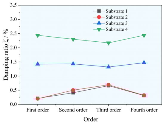 The frequency response function of the four specimens is obtained by modal analysis. From the amplitudes of the four specimens at seven measuring points, it can be seen in Figure 10, Figure 11, Figure 12, Figure 13, Figure 14, Figure 15 and Figure 16 that although specimens 1 and 2 are of the same material, their frequency response characteristics are slightly different due to problems such as machining accuracy and the defects of the material itself; the natural frequency and the amplitude of the frequency response function of the composite structure coated with damping material is smaller than that of the base material. The thicker the damping material, the smaller the amplitude of the frequency response function. The damping ratios of the four specimens’ first four orders are obtained through modal identification and calculation. The data show that the damping material makes a great change in the damping ratio of the composite structure. At the same time, it can be seen in Figure 17 that the damping ratio of the composite structure, whose damping material is twice as thick as that of the base material, is larger, indicating the thickness ratio of damping material to substrate is a key factor affecting the damping performance of composite structures.