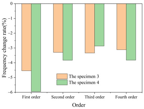 Comparing the first four-order natural frequencies of specimens 3 and 4, when the thickness of the damping layer is one times the thickness of the base material, the change rate of the first-order natural frequency is the largest, which is reduced by 4.54%; when the thickness of the damping layer is two times the thickness of the base material, the change rate of the third-order natural frequency is the largest, which is reduced by 5.95%.