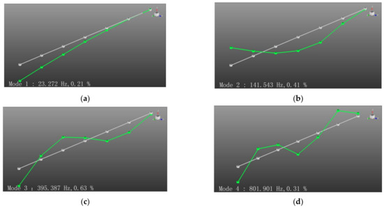 The modal is the vibration characteristic of the structure itself []. The modal parameters of the structure (such as natural frequency, mode shape, damping ratio, etc.) are identified through modal analysis, and then the dynamic and damping characteristics of the structure are obtained. El-Labban et al. carried out Modal tests to evaluate the dynamic characteristics: natural frequency and damping ratio []. Modal analysis was carried out on simply supported steel truss bridges []; the modal frequencies and modal shapes of the bridge are identified. When the simply supported steel truss bridge is damaged, the identified modal parameters have changed, and a damage detection method is proposed. Cheng Guan et al. [] analyzed the modal parameters of a full-scale wood composite panels supported on four nodes to determine the elastic moduli (E) of the major and minor axes, as well as to determine the panel’s In-plane shear modulus test method. Yakout, Mostafa et al. introduce an experimental procedure for predicting the fatigue life of each individual rolling element bearing separately using vibration modal analysis [].