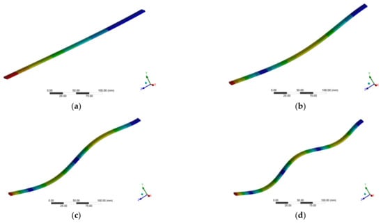 The first four-order simulation modal diagram. (a) First-order mode shape; (b) second-order mode shape; (c) third-order mode shape; and (d) fourth-order mode shape.