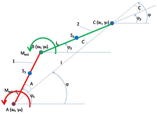 The main part of a three-axis articulated robot is the two planar movable arms operated by two actors. This simplified system will be taken into account in this paper [,,,,]. The optimal trajectories of a robot can be synthesized and controlled only by a predictive, dynamic design, taking into account the dynamic kinematics of the robot [,,,,,,,,,]. No matter how many degrees of mobility an articulated robotic system has, it will be initially operated by a rotating platform that orients it quickly in space, which is also its spine, then two arms resembling a human hand, i.e., an arm and a forearm, in order to then directly insert the defector, or several additional modules with several degrees of mobility. For this reason, the main part of the system is the arm and forearm, as will be studied in this paper.