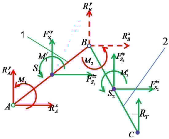 In the first relation, whichrepresents the sum of the forces acting in the machine only on the abscissa axis (x-axis), we meet the inertia forces in the system concentrated in the centers of mass S1 and S2, respectively, oriented on the x-axis. In the second relation, whichrepresents the sum of the forces acting in the machine only on the y-axis, we meet the inertia forces in the system concentrated in the centers of mass S1 and S2, respectively, oriented on the y-axis, and the technological endurance RT, the force which the machine must bear or overcome during the active working period; m1 represents the mass of element 1, and m2 that of element 2; ω1 represents the angular velocity of element 1; ω2 represents the angular velocity of element 2; ε1 represents the angular acceleration of element 1; ε2 represents the angular acceleration of element 2; S1 = AS1 and S2 = BS2 represent the distances to the centers of mass of elements 1 and 2, respectively; l1 = AB and l2 = BC represent the lengths of the two elements 1 and 2, respectively.