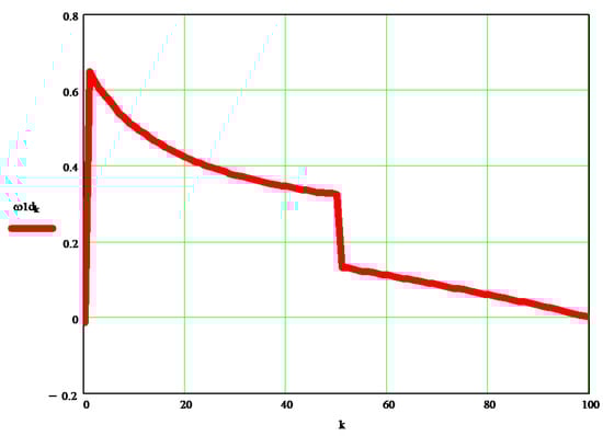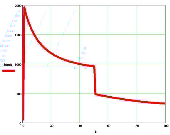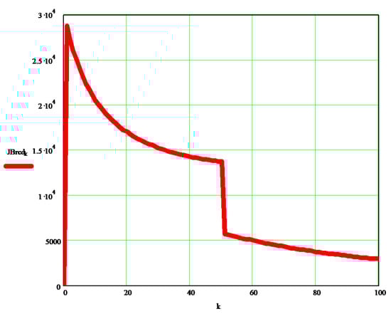 Figure 3 and Figure 4 show the variations of mass (mechanical) moments of inertia (JAred, or JBred [kg·m2]) reduced to a coupling A (element 1), and B (element 2), depending on the independent variable (k) initially chosen in the program, which in turn may depend on the rotation angle of elements 1 and 2, respectively, or directly on the time t (see the program written in Mathcad, in Appendix A).