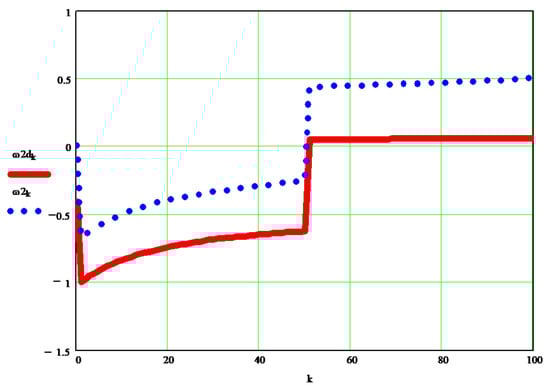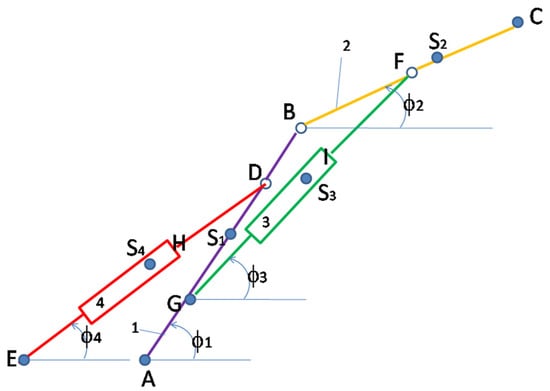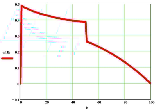 There are two original basic aspects in the presented method: (1) the generalized way in which the moments of mass inertia of the whole mechanism are written, reduced to any of the desired elements of the machine, using the kinetic energy conservation equation of the whole mechanism; (2) the generalized way in which the angular velocities of each element of the mechanism are determined by using an original relation already presented in previous work [,], now repeatedly for each element of the machine, in this case of the simple articulated robot. For a better understanding of this original dynamic method with wide use, the author presents it in the paper and applies it to another type of robot in Section 4. For element 1, the moment of reduced mechanical inertia in joint A is determined, and for element 2, the moment of reduced mechanical inertia in joint B is determined. The classical dynamic angular velocity of each actuator (w1, w2) is determined according to the kinematic angular velocity and the variation of the respective moment of inertia (1, or 2) reduced to its joint (A or B). The method is simple, straightforward, and original [,]. Dynamic angular accelerations are determined directly from the angular velocities by approximate numerical derivation (using the Taylor series development). The solution ofsolving Lagrange’s equations of the second kind (here being two degrees of mobility, so two independent variables) generates larger errors, and for this reason, we resorted to the method of finding direct angular accelerations based on dynamic, real angular velocity values [,].