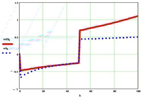 The original dynamic angular velocity w2d [s−1] can be seen in the graph in Figure 11, and the differences between it and the kinematic velocity w2 [s−1] are visible in the diagrams in Figure 12.