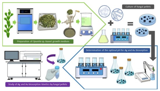 The following supporting information can be downloaded at: https://www.mdpi.com/article/10.3390/pr10040645/s1, Figure S1: Linearized Ag biosorption kinetics by different quantities (dry weight) of Aspergillus tabacinus pellets; Figure S2: Linearized Au biosorption kinetics by different quantities (dry weight) of Aspergillus tabacinus pellets; Figure S3: Linearized Ag biosorption kinetics by different quantities (dry weight) of Cladosporium cladosporioides pellets; Figure S4: Linearized Au biosorption kinetics by different quantities (dry weight) of Cladosporium cladosporioides pellets.