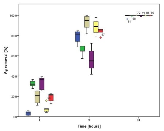 Figure 2 shows the Ag removal achieved by A. tabacinus pellets at different pH values (2–7) after 1, 3, and 24 h of contact. In general, Ag removal increases along with contact time. The decrease in Ag concentration observed in the tests can be unequivocally attributed to biosorption on the pellets because the initial concentrations of the blanks at different pH values (2–7) did not present significant variations (p ≤ 0.05) in the samples taken.
