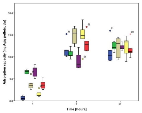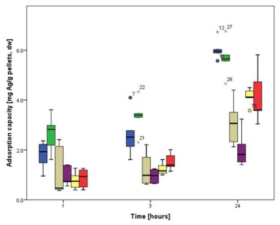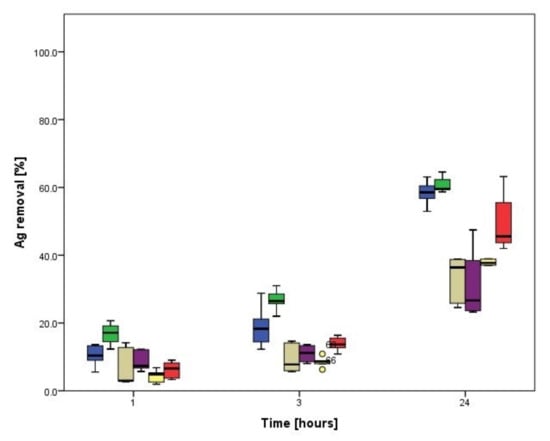 As Figure 3 indicates, the best Ag adsorption capacities in A. tabacinus for 3 and 24 h were obtained at pH 4, which agrees with previous reports about the recovery of Ag(I) from electronics industry wastewater on a clay mineral compound [39]. However, in the present study, a suboptimal pH value (5) was selected for the subsequent experiments because it allows more reproducible values of metal concentration to be obtained. Regarding the contact time, the highest removal percentages were observed after 24 h of contact in the entire pH range evaluated.