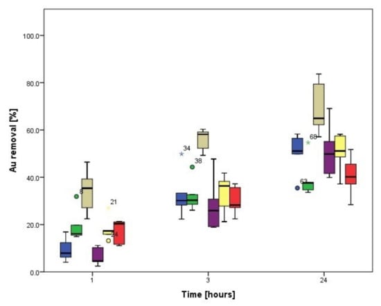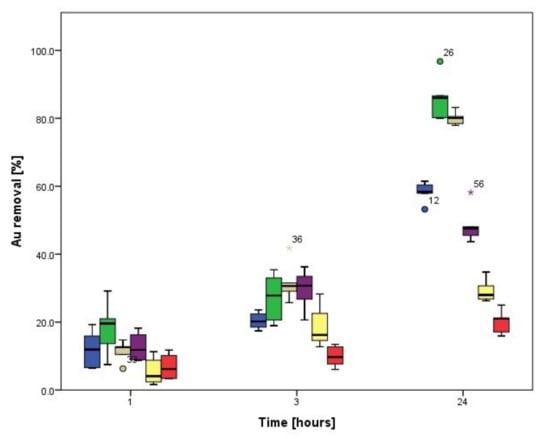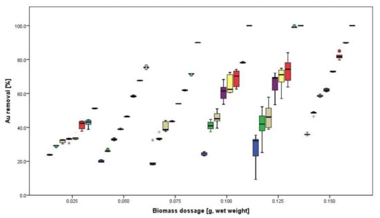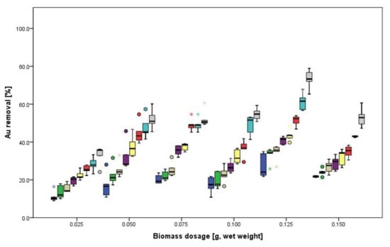 As mentioned above, Au removal increased when using the highest doses of biosorbents and the most extended contact times. After 12 h of contact, the removal percentages obtained (42.48–99.22%) differed significantly (p ≤ 0.05) between the doses of biosorbents analyzed. In addition, at a contact time of 24 h, Au removal percentages did not present significant differences (p ≤ 0.05) from those obtained at a contact time of 12 h.