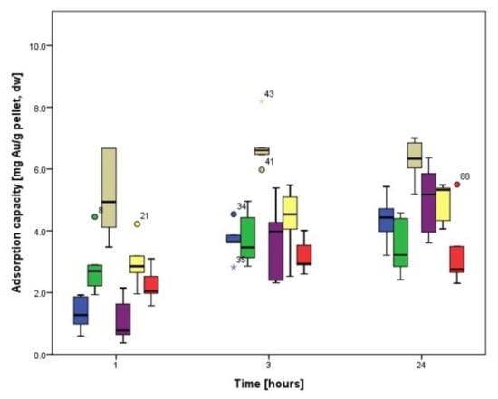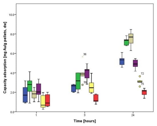 For Au, the highest removal percentages (Figure 8) and adsorbed amounts (Figure 9) by C. cladosporioides were measured after 24 h of contact. This time is considerably higher than the 100 min applied in a previous study [49], after which about 90% of a 100 mg Au/L solution was removed, and an adsorption capacity of 100 mg/g was determined. However, these authors used pellets of dry biomass of C. cladosporioides bound to keratin, which prevents direct comparison with the values reported here.