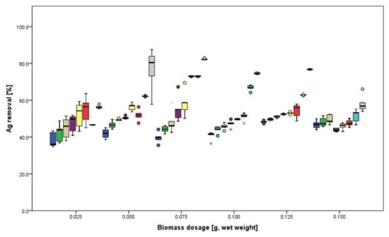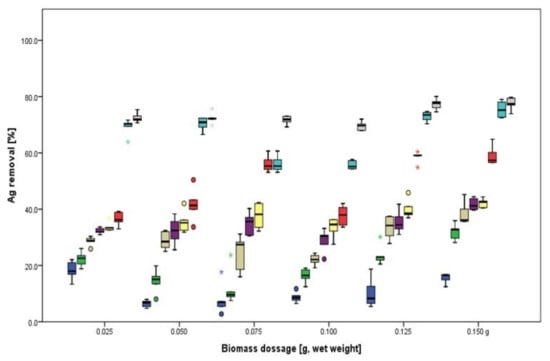 Regarding the control of the adsorption time, in the case of Ag, it has been found that many fungal cultures adsorb half the concentration of the medium in the first five minutes of the process and that it ends after two or three hours [10]. However, several other factors influence biosorption, including the medium pH [1,25], which we investigated herein. This variable affects the speciation of metal ions and also influences the surface properties of adsorbents [26], which modifies the dissociation of linking groups and their surface charge, the activity of functional groups (mainly carboxylate, phosphate, and amino groups) in biomass [27], as well as the competition of metal ions with hydronium ions for adsorption sites [28].