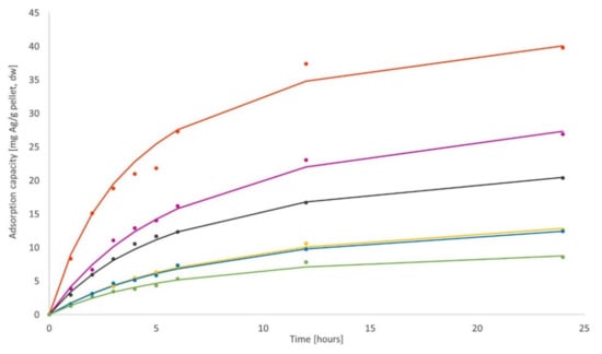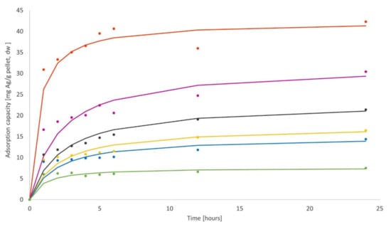 As Figure 11 suggests, the amount of Ag adsorbed on A. tabacinus pellets increases with time until saturation occurs (i.e., a plateau appears) due to a decrease in the adsorption concentration gradient. Both the level of the plateau and the initial slope of the curve depend on the mass of adsorbent used. At low dosages of biosorbent, its active sites are entirely exposed to the adsorbate, leading to a fast and efficient occupation of the available adsorption surface [52,53]. Therefore, biosorption kinetics can only be compared if similar amounts of adsorbent are used and other variables, such as the initial adsorbate concentration, are held constant [52]. For example, in the tests carried out with the highest doses of adsorbent (0.0076 and 0.0108 g dw), the plateau was reached after the first hour of contact, while with the lowest amounts of pellets (0.0019–0.0050 g dw), the plateaus were less sharp and reached after about five hours.