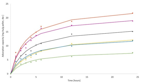 The linearized kinetics of the adjusted pseudo-second-order model are presented in Figure S4 (Supplementary Material), which also shows the good agreement of the data to this model. Parameters summarized in Table 5 were used to simulate the changes that occurred in the amount of Au adsorbed at a given time (qt); the simulation results are presented in Figure 17. The good fit of the experimental data to the pseudo-second-order model was confirmed. Moreover, as evidenced by the statistical analysis, the Au adsorption was almost complete after a contact time of 12 h.