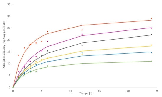 Ag and Au biosorption kinetics were modeled through the pseudo-second-order model, which is represented by the following differential equation