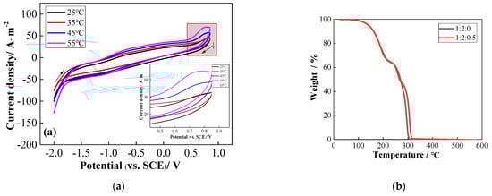 (a) Cyclic voltammograms of 1:2:0.5 TDES at different temperatures with a scan rate of 100 mV·s−1 at room temperature (25 °C); (b) TG curves of BDES and 1:2:0.5 TDES.