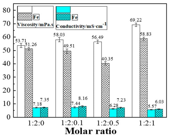 According to the analysis of Figure 8, near 3300 cm−1, the stretching frequency of the hydroxyl group in the ternary pure solvent is lower than that in the binary pure solvent, which means that the force of the intermolecular and intramolecular hydrogen bonds is weakened []. With the addition of FeCl3 6H2O redox pairs, a peak of Fe-OH appears near 1698 cm−1 []. Specifically, the peak intensity Fe-OH of the binary electrolyte is higher than that of the ternary electrolyte. It can be inferred that the chloride ion–metal cation–ethylene glycol supramolecular complex is formed in the binary system, which impedes the migration of metal cation. The introduction of glycerol destroys the original iron-based hydrogen bond network structure, breaks the complex supramolecular complex, and releases some small metal ions, which reduces the migration resistance of ions in the redox flow battery. The results are consistent with those of impedance analysis.