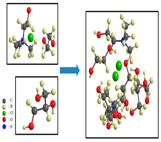 Abbot et al. presented the concept of “deep eutectic solvent” (DES) in 2004 []. DES is a eutectic mixture composed of a hydrogen bond acceptor (HBA, such as quaternary ammonium salts) and a hydrogen bond donor (HBD, such as carboxylic acids and polyols) in a certain stoichiometric ratio. DES is a new type of non-aqueous solvent with solubility []. It has been observed that DES has almost the same advantages as ionic liquids. In addition, DES has the characteristic of biodegradability and synthesis without purification to save costs. In this sense, it is a promising “green” solvent. DES has been used in many fields, such as catalyst precursors [,] and solvents for extraction and separation [,], materials chemistry [,], pretreatment and separation solvent of cellulose in biomass [,], electrochemistry [,,], etc. However, most research is still concentrated upon binary deep eutectic solvents.