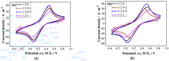 At two different scanning rates in Figure 4, with different additions of glycerol, the peak potential difference decreases at 1:2:0.5, the reversibility is the strongest compared with other ratios, and the peak current density is the largest. With the sweep rate from 50 mV·s−1 to 100 mV·s−1, the peak current densities of 1:2:0.1 and 1:2:0.5 increase from 55.00 A·m−2, 59.59 A·m−2 to 55.59 A·m−2, 79.46 A·m−2, respectively. The increase rate of 1:2:0.1 is obviously weaker than that of 1:2:0.5. It is speculated that the addition of a small amount of glycerol has no effect on the reconstruction of the hydrogen bond network after the sweep rate increases. It reveals the importance of the appropriate molar ratio of the components for the construction of a hydrogen bond network. In the above experiment, the background current of electrolyte lower than 0.1 mol·L−1 is larger. In order to avoid background subtraction and simplify data analysis, an electrolyte with a concentration of 0.1 mol·L−1 was selected. As can be seen from Figure 5, the background current was only about 2% of the redox peak, which did not affect the analysis of battery performance. The data in Table 2 are the iron ion diffusion coefficient calculated according to the Randles–Sevcik equation. Detailed calculations are shown in Figure S1 of the Supplementary. With the addition of glycerol, the iron ion diffusion coefficient reaches the maximum value of 8.29 × 10−7 at the molar ratio of 1:2:0.5 and improves by about 1.5 times.