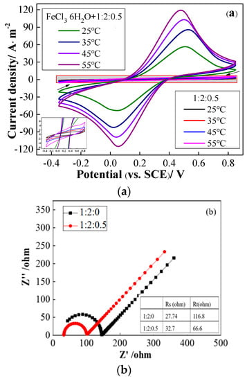 (a) Cyclic voltammogram of the DESs with 0.1 mol·L−1 FeCl3·6H2O in different temperatures at the scan rates of 50 mV·s−1; (b) electrochemical impedance spectroscopy of the DESs with 0.1 mol·L−1 FeCl3·6H2O dissolved.