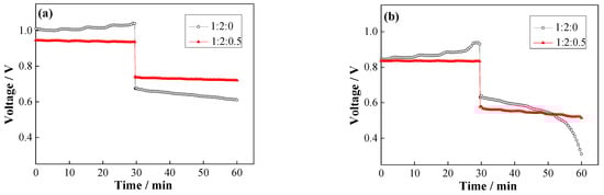 The charge–discharge current density of the battery was set to 2 mA·cm−2, and the charge–discharge time was set to 30 min. According to the following Equations (1)–(3), since the charge and discharge currents are both 2 mA·cm−2, the default Coulomb efficiency (CE) is about 100%, and the voltage efficiency (VE) is approximately equal to the energy efficiency (EE). It can be seen from Figure 7a that the charging voltage decreased significantly, the discharging voltage increased, and the energy efficiency of the battery increased from 63.06% to 77.41% after glycerin was added in the first charge–discharge cycle. In the fifth cycle, the energy efficiency dropped to 65.12% when glycerol was added, but it was still relatively stable, while the energy efficiency without glycerol began to drop sharply in Figure 7b. The results show that the addition of glycerin to BDES can enhance the redox to electrochemical generation in the graphite felt electrode of the battery. Thus, the energy efficiency of the battery is improved and the charge–discharge performance of the battery is improved.