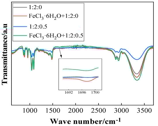 FT-IR spectra of the two different ratios of DESs without and with 0.1 mol·L−1 FeCl3·6H2O dissolved.