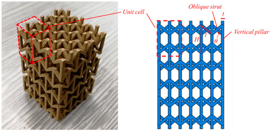 According to the previous research [22,24], the auxetic structure shown in Figure 1 is combined with several unit cells of umbrella shape, and the auxetic effect is caused by the enfoldment of the structure. In this research, the mechanical property of the bronze SLM structure and MA structure are studied. As the unit cell and the total structure is symmetrical, the mechanical behavior of the structure along the vertical direction during the compression process is important. The coefficient of the 3D auxetic structure has been shown: t is the thickness of the pillar, θ is the angle of the vertical and oblique strut, l is the length of oblique strut and H is the length of vertical pillar.