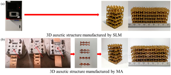The SLM 3D auxetic structure is prepared via a Riton R120 metal 3D printer. It is a 3 × 3 × 3 layer 3D structure contains 27 unit cells. Side holders are applied to prevent the material falling from the structure during the 3D printing process, and then removed after 3D printing is finished. The MA 3D auxetic structure is produced by microforming and micro assemble process. A bronze foil is delivered in the progressive molding tool and the blanking process is conducted at each stage. Four kinds of 2D parts are produced via microforming and then assembled into a 3D auxetic structure, as shown in Figure 2.